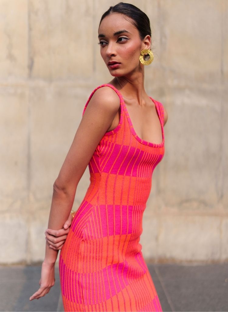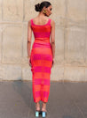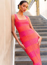 A fitted sleeveless maxi dress with a striped texture featuring a scoop neck and wide shoulder straps. Length 54". The model is 5'9" and is wearing size S.