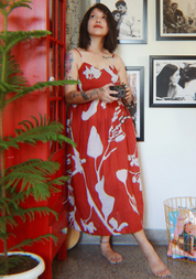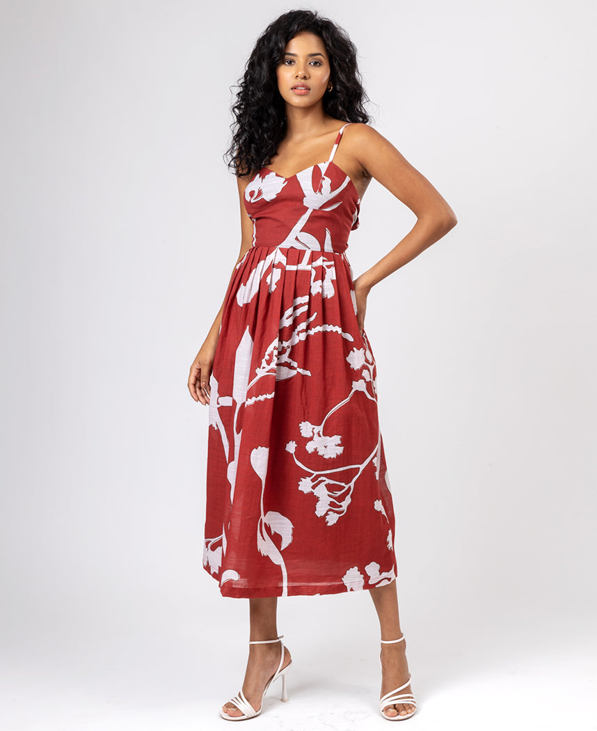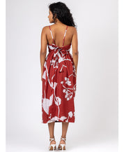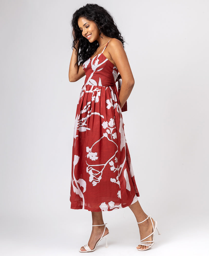 A printed midi dress with thin straps and inseam pockets featuring pleats at the waist and a bow detail at the back. Length 48". The model is 5'7" and is wearing size S.