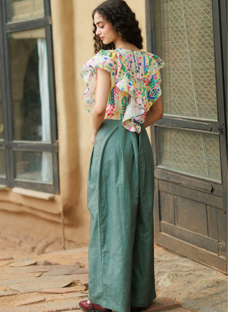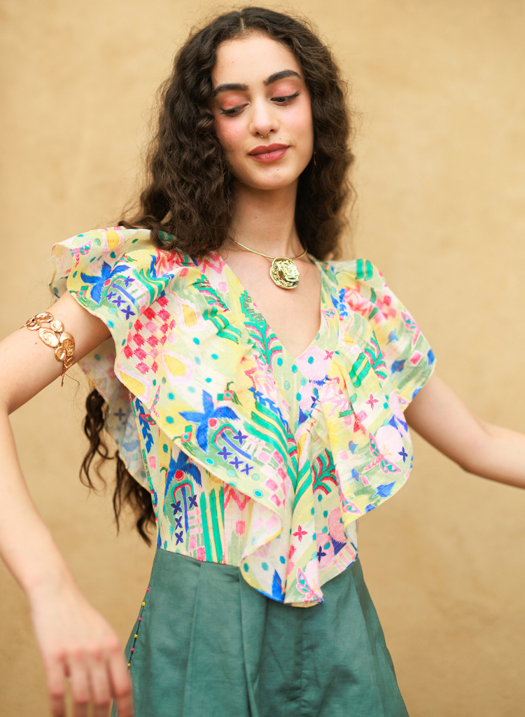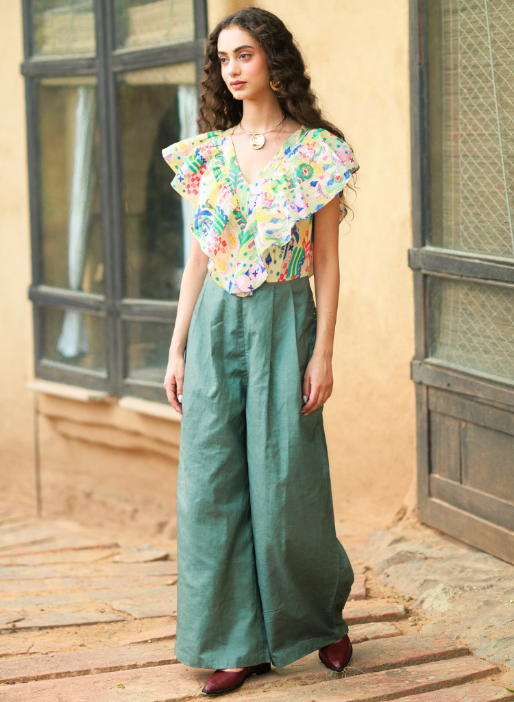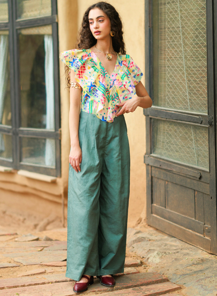 This playful jumpsuit features a ruffled top and pleated flares — pineapple printed like bold decisions made on whim and ink. Pant length 44", Top bodice 18". The model is 5'6" and is wearing size XS.
