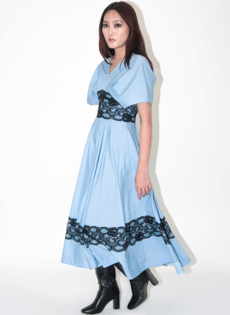 A lace detailed circular cut dress with a pleated bodice and extended sleeves featuring a fitted waist with a back elastic. Length 51". The model is 5'10", and is wearing size S.