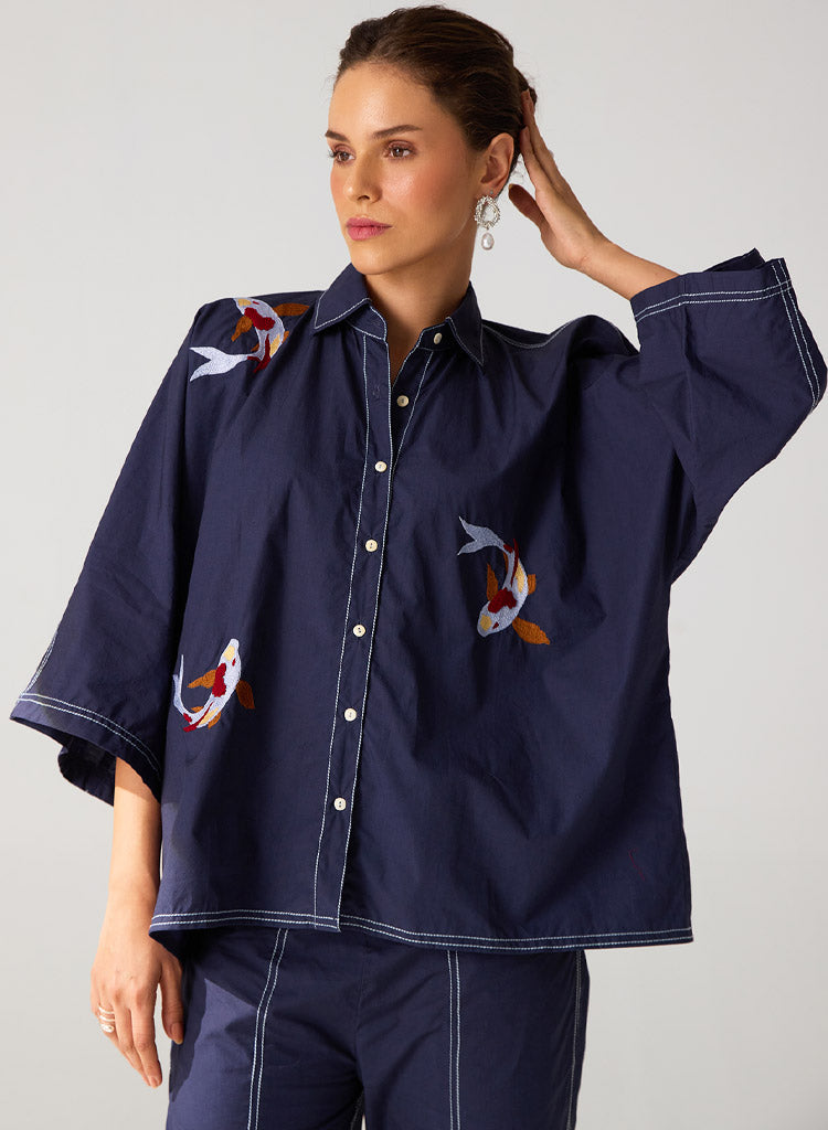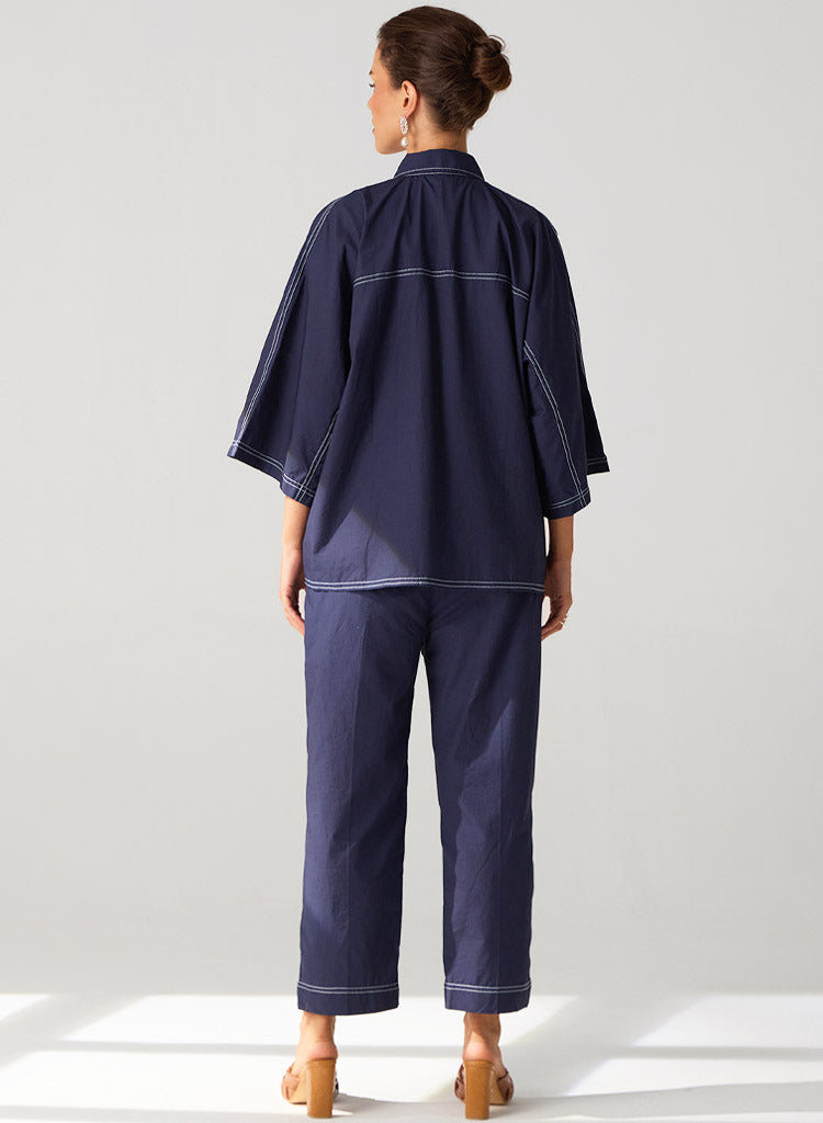 A two-piece set pairing a hand-embroidered shirt with matching pants. The hand embroidered shirt with contrast stitches features a front button placket and kimono sleeves. Length 25". The matching pants feature curved insert pockets and half elasticated belt. Length 36". The model is 5'8", and is wearing size S.