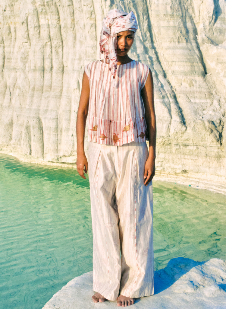 A two-piece set pairing the May Box Pleat Top and the Thura Pleated Pants. The classic hand-screen-printed silhouette features sculpted box pleats and an open neckline. Length 21". The pleated pants with hand-screen-printed lining with a plain outer layer features side pockets, a front placket, a zipper and an elasticated waist. Length 41.5". Lined. The model is 5'8" and is wearing a size M.