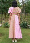 A half and half printed A-line maxi dress with a side cut-out detail and shells on the bodice featuring a round neckline, short puff sleeves and a back keyhole closure. Length 52.5”. The model is 5'6" and is wearing a size S.
