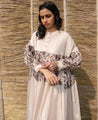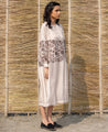 A relaxed hand-block printed midi dress with a pintuck yoke. Features gathering at the yoke, a front button placket and cuffed sleeves. Length 43". The model is 5'7" and is wearing a size S.