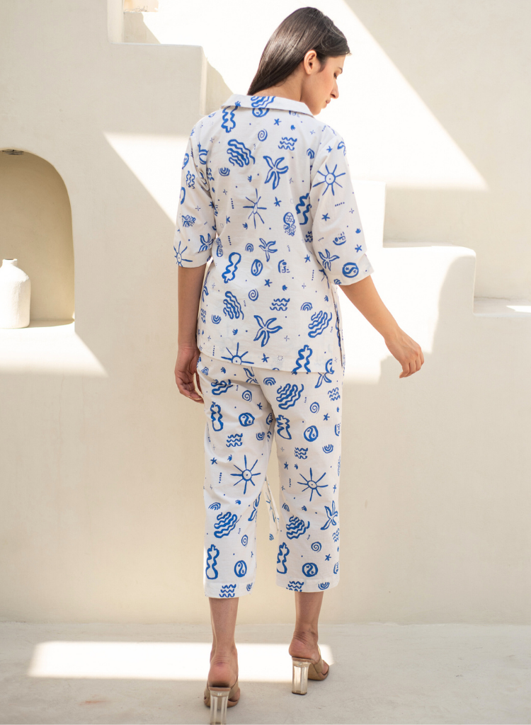 A two-piece set pairing a Kimono style jacket and matching pants. The overlap jacket features a lapel collar and a side tie-up. The pants feature an elasticated waist and in seam pockets. The model is 5'6 and is wearing size S.