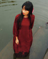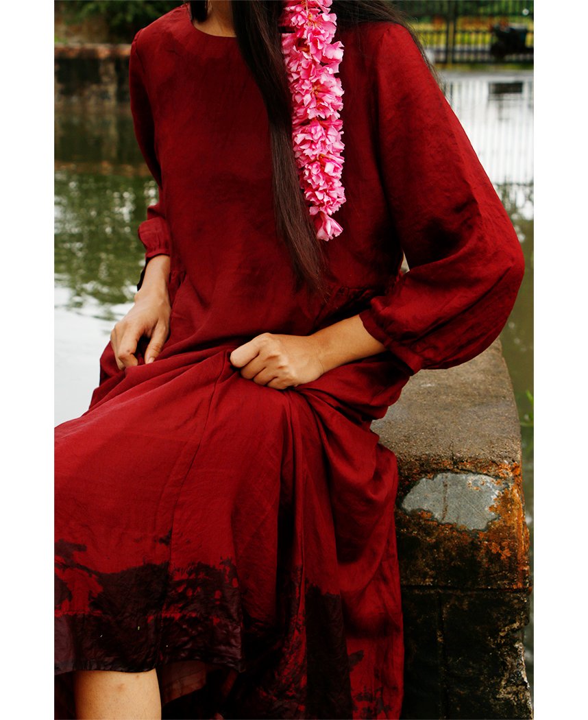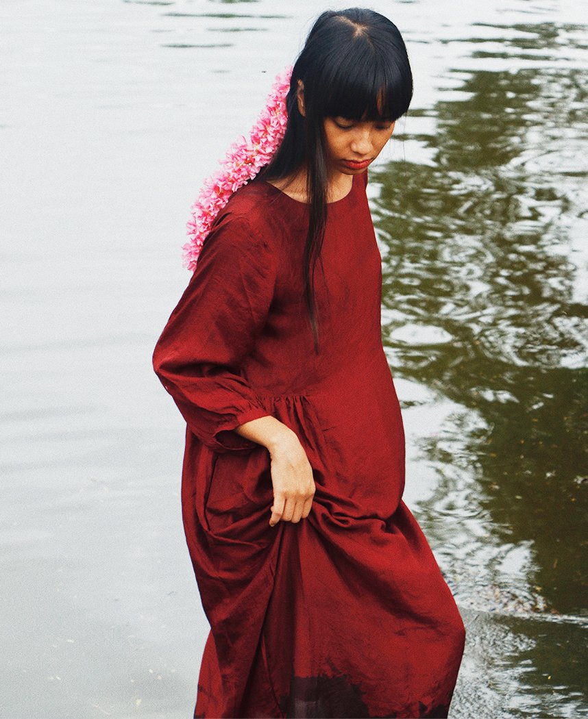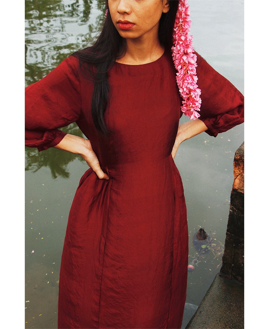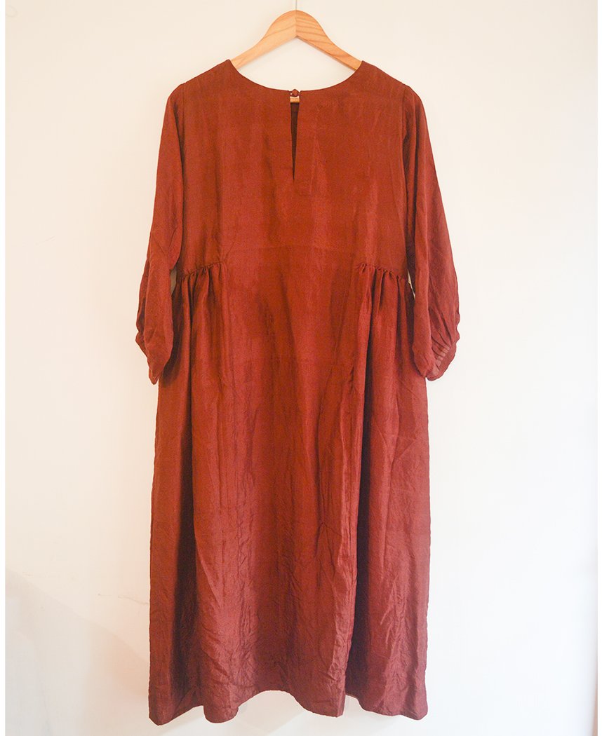A relaxed dress with side gathers made in handwoven mulberry silk. Features gathered sleeves, a closed round neck, and a keyhole button back. Length 46". The model is 5'4" and is wearing a size S. Comes with a rose handwoven cotton slip.