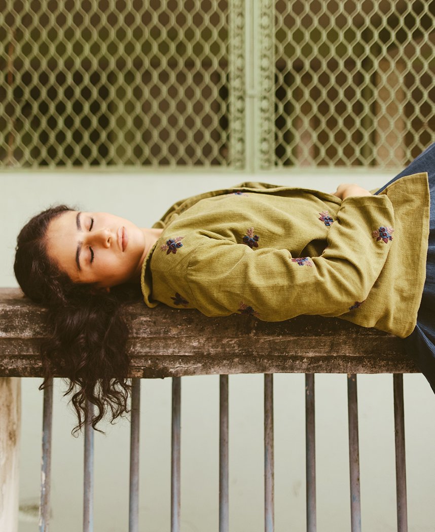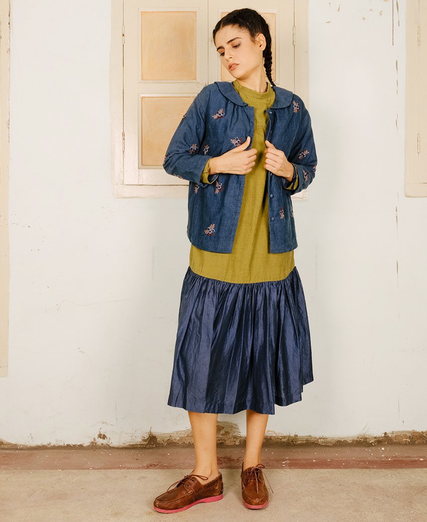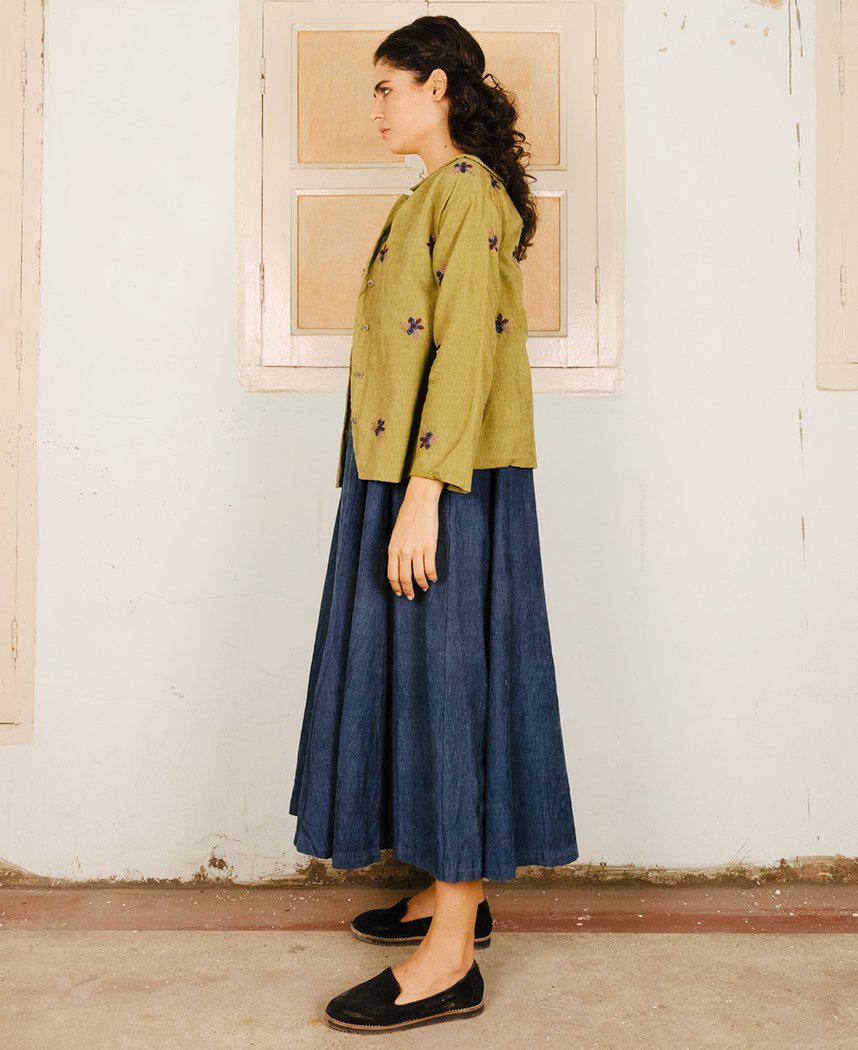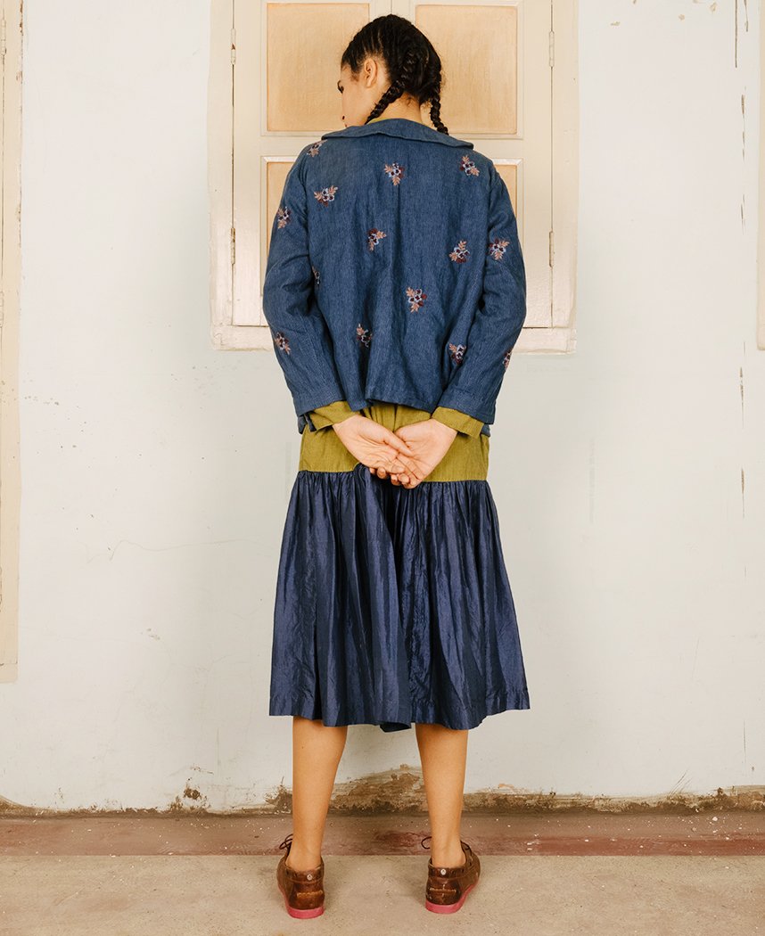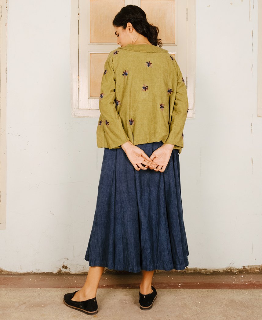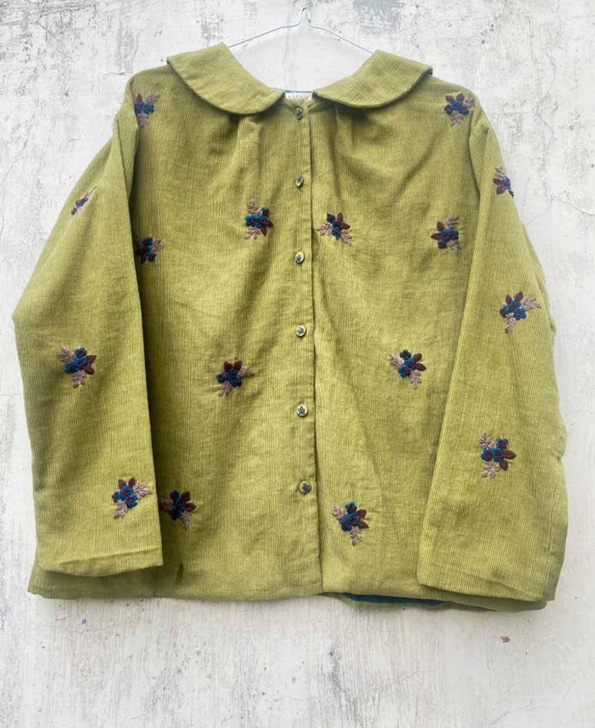 A cropped jacket with hand-embroidered flowers. Features a Peter Pan collar and front button placket. Length 23". The model is wearing a size S. Made in 100% cotton corduroy, with cotton lining.