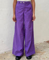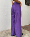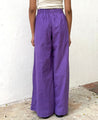 A pair of wide leg pants featuring a hidden elasticated waistband and inseam pockets. Length 40". The model is 5'6" and is wearing a size S.