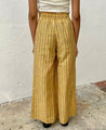 A pair of wide leg pants featuring a hidden elasticated waistband and inseam pockets. Length 40". The model is 5'6" and is wearing a size S.