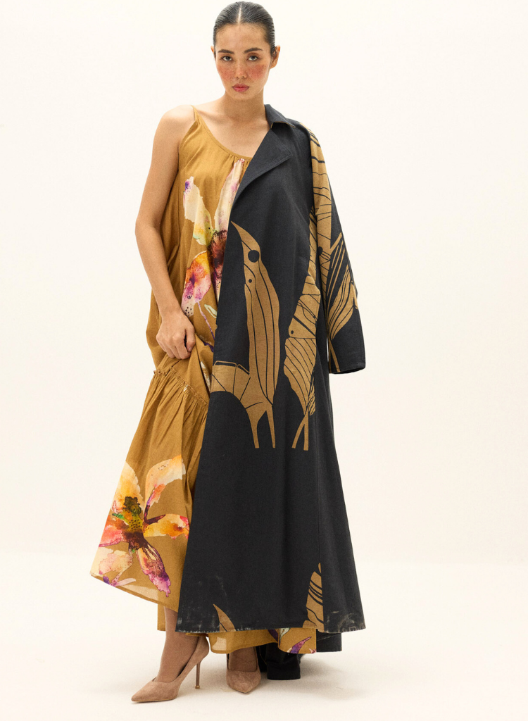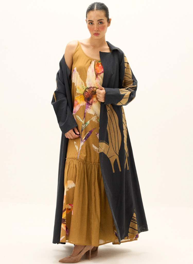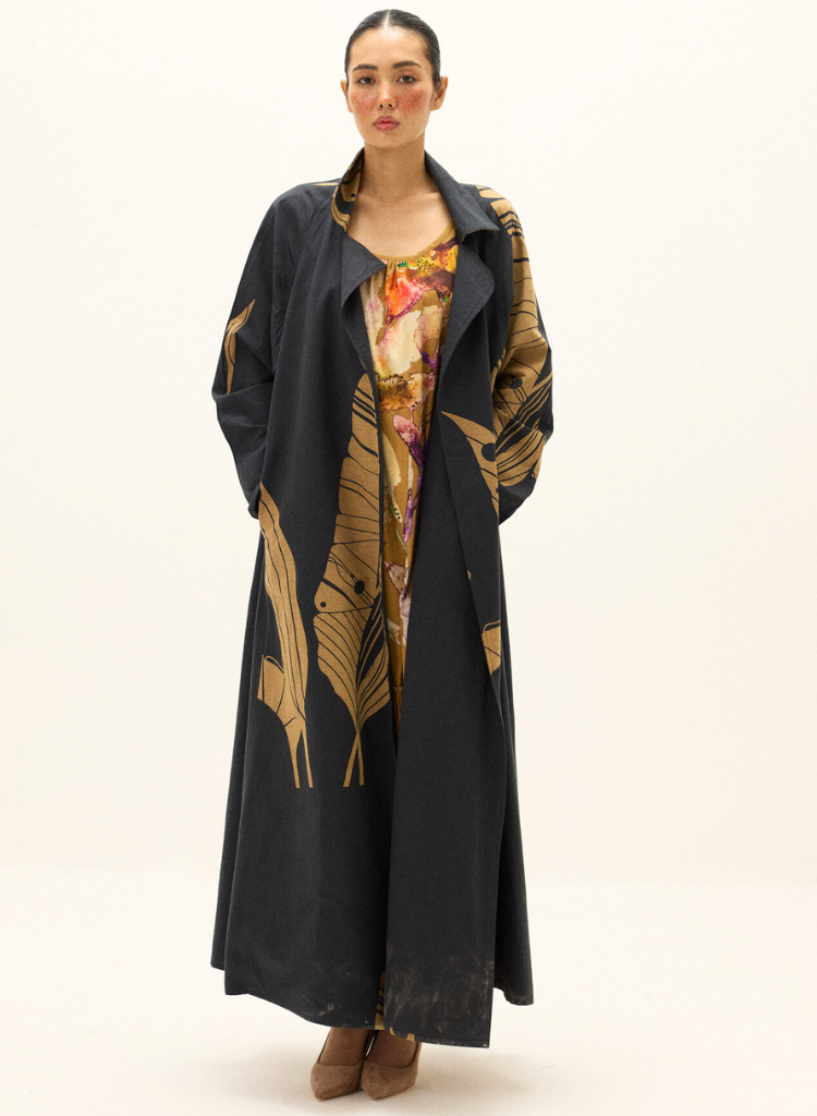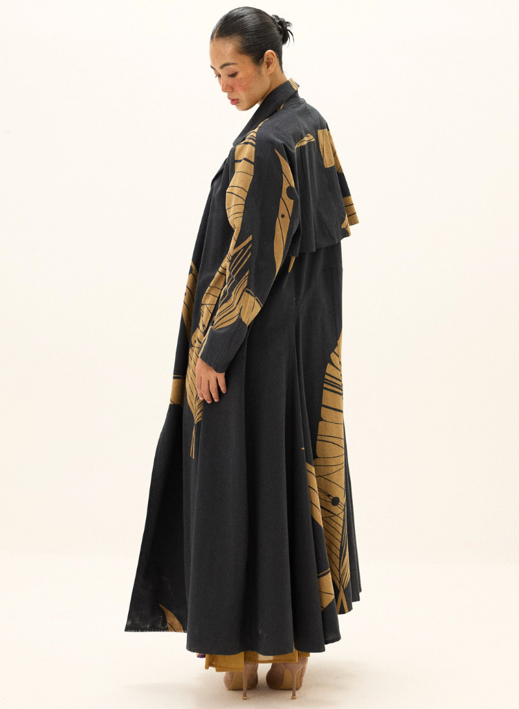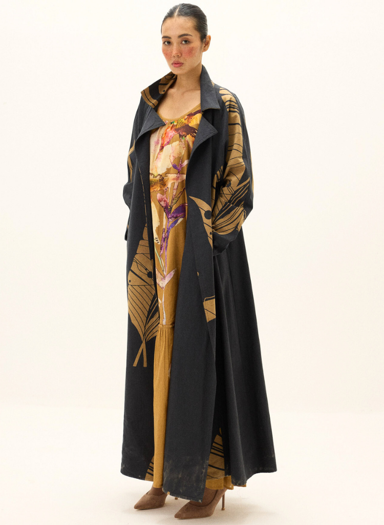 A dramatic full-length coat featuring bold oversized leaf motifs in earthy ochre tones on a deep charcoal base. Features a relaxed drape, wide lapels, and concealed pockets. Length 54". The model is 5'6" and is wearing a size S.