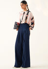 A pair of solid wide legged pants with front pleats featuring a fitted waist with a front button opening and inseam pockets. Length 40". The model is 5'7" and is wearing a size XS.