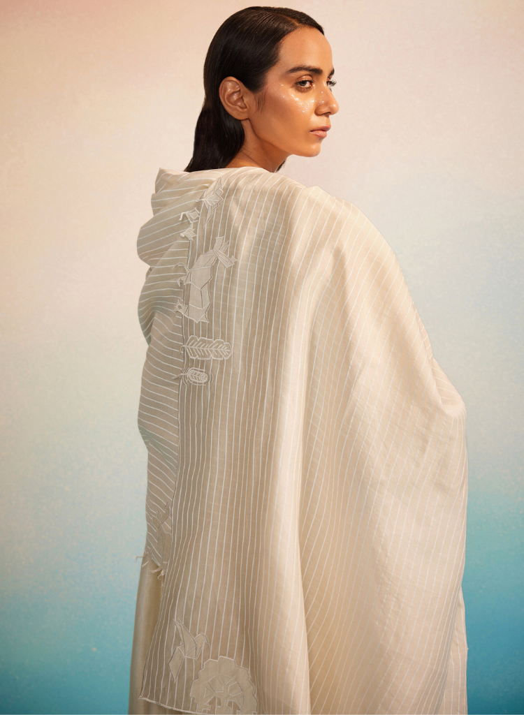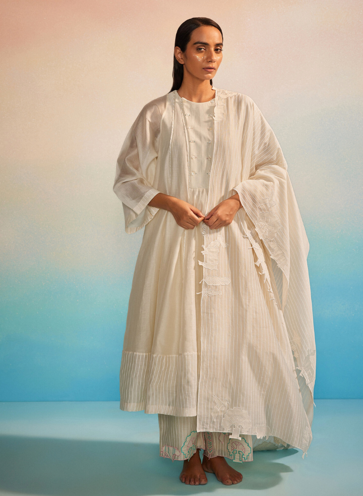 A three-piece set pairing the Midori Panelled Kurta, the Shiori Appliqué Pants, and the Kofu Dupatta. The panelled midi dress with delicate buttons adorn the yoke, while subtle striped bindings trace the seams, adding a quiet sophistication to the design. Thoughtfully constructed with multiple panels, Midori captures the beauty of contrast and craftsmanship in every fold. Length 46". The relaxed yet refined striped pants feature a soft drawstring waistband with delicately finished ends and functional side pockets for everyday utility. Appliqué embroidery at the hem adds a tactile finish, quietly elevating the piece with subtle detail. Length 38". The model is 5'6" and is wearing a size M. Made in Chanderi. Lined. Lightweight and airy, the Kofu Dupatta is crafted in striped hand screen-printed Chanderi, offering a soft sheen and gentle drape. Delicate appliqué embroidery adds texture and quiet detail, making it a versatile piece to elevate both everyday and occasion wear. Length 2.4m.