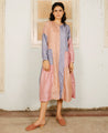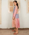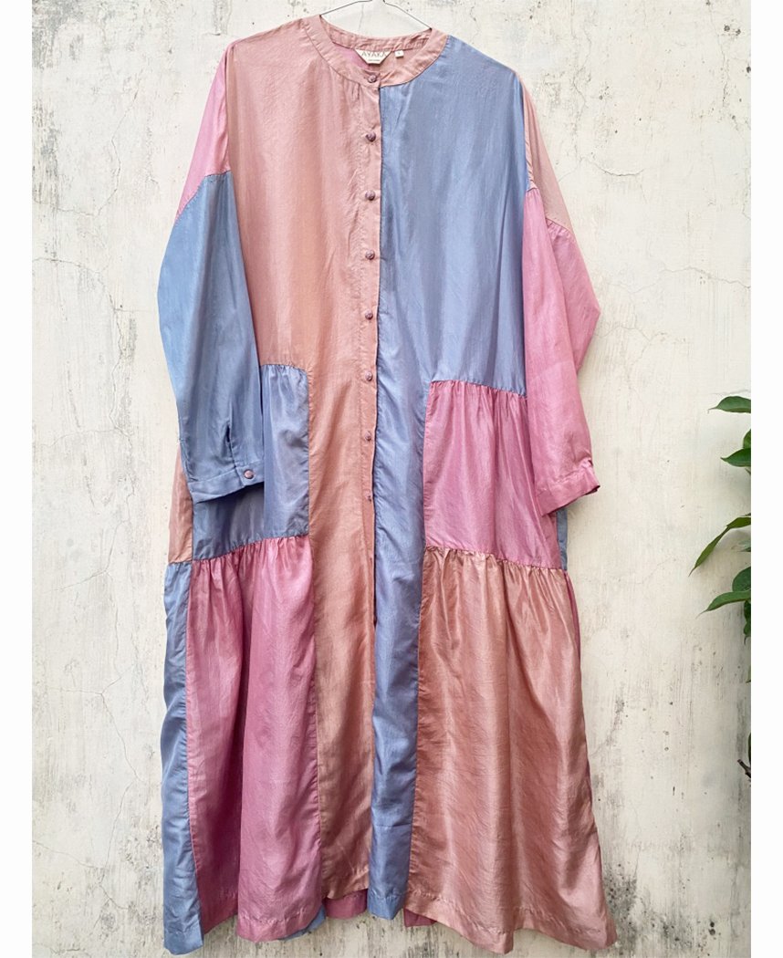 A tiered A-line dress with pastel panels and side gathers details. Features a front placket with hand embroidered buttons. Length 44". The model is wearing a size S. Made in 100% mulberry silk.