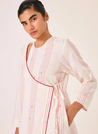A striped wrap tunic with Jamdani motifs and piping details featuring a single loop button fastening on the shoulder, 3/4th sleeves and inseam pockets. The model is 5'7 and wearing a size XS.