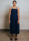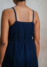 A midi cami dress with a front gather detail featuring an adjustable drawstring on the waist. Length 46". The model is 5'4" and is wearing a size S.