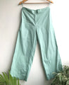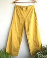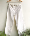 Classic wide leg trousers made in 100% cotton. Features a front zipper, elasticated back and inseam pockets. Length 35". The product displayed is a size S. Gentle hand wash in cold water with mild detergent.