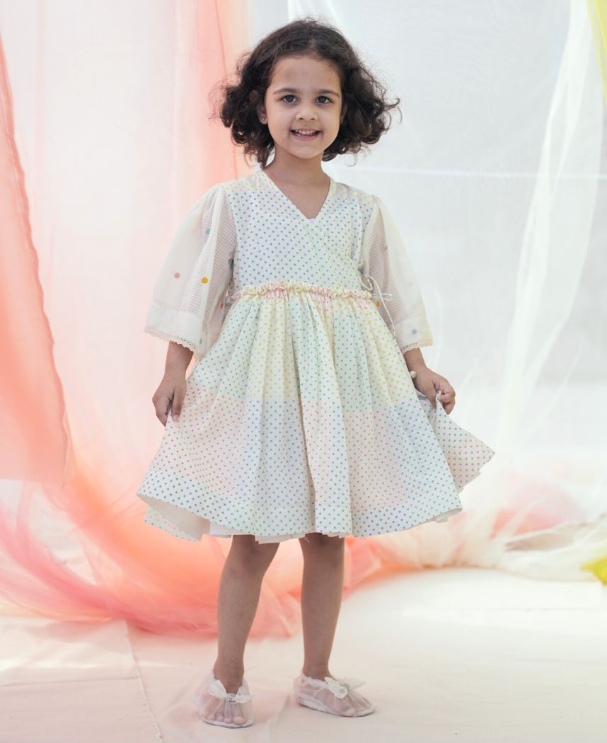 A flared wrap dress with hand-block printed confetti polka dots and delicate lace details. Features embroidered polka dots on the sleeves and tie-up strings at the side.