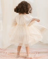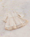 A gathered angrakha style dress with lace detailing at the hem and sleeves. Features tie-up strings at the front with hand-crocheted floral tassels.