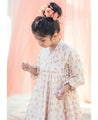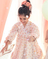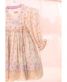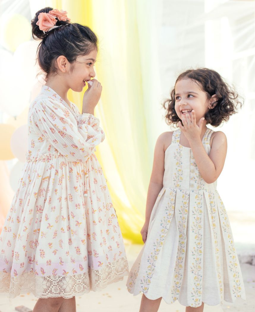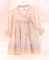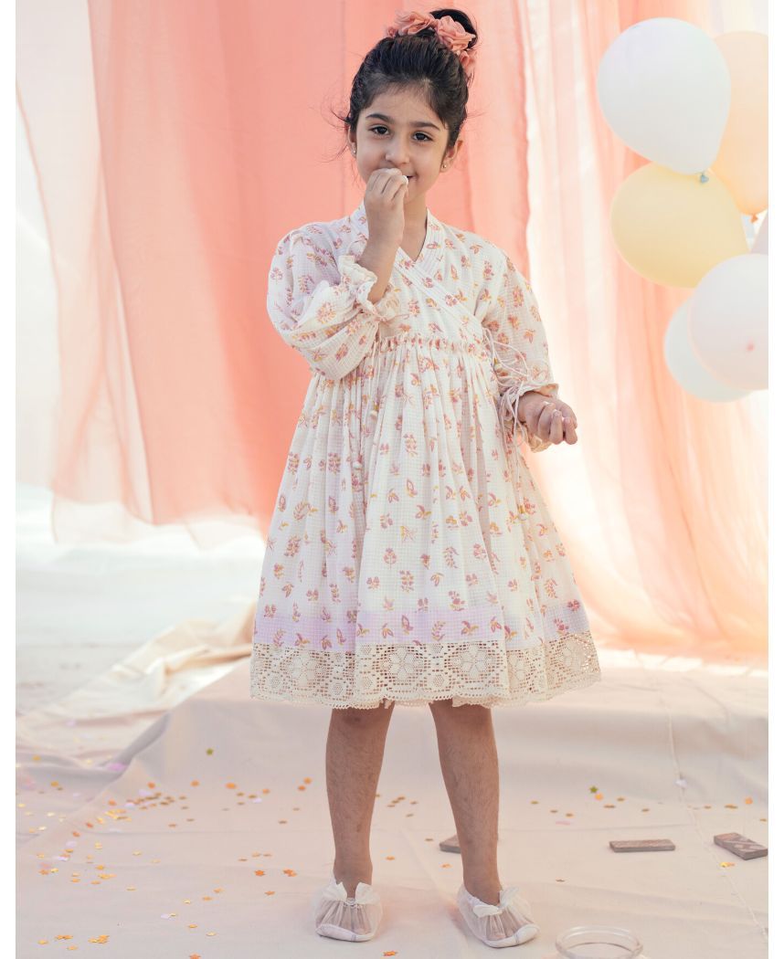 A flared wrap dress with hand block printed flowers and delicate lace details. Features gathered sleeves and tie-up strings at the side.