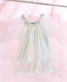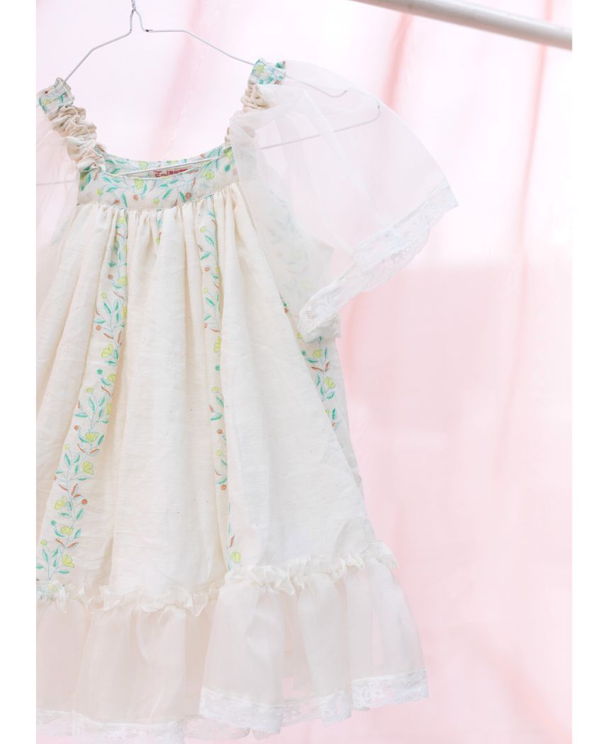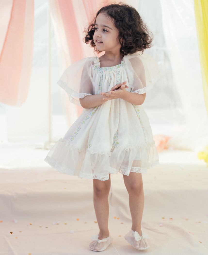A gathered dress with hand block printed floral stripes and organza sleeves and hem. Features elasticated shoulders.