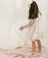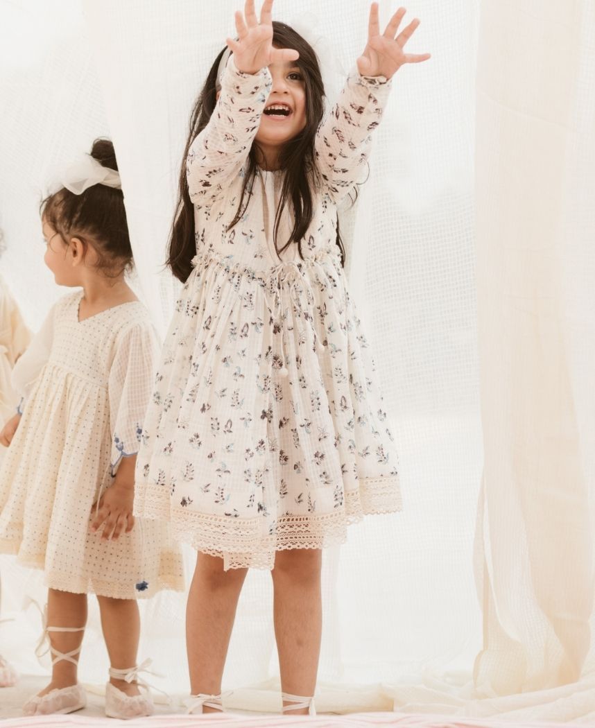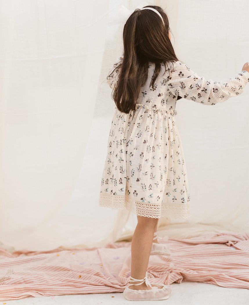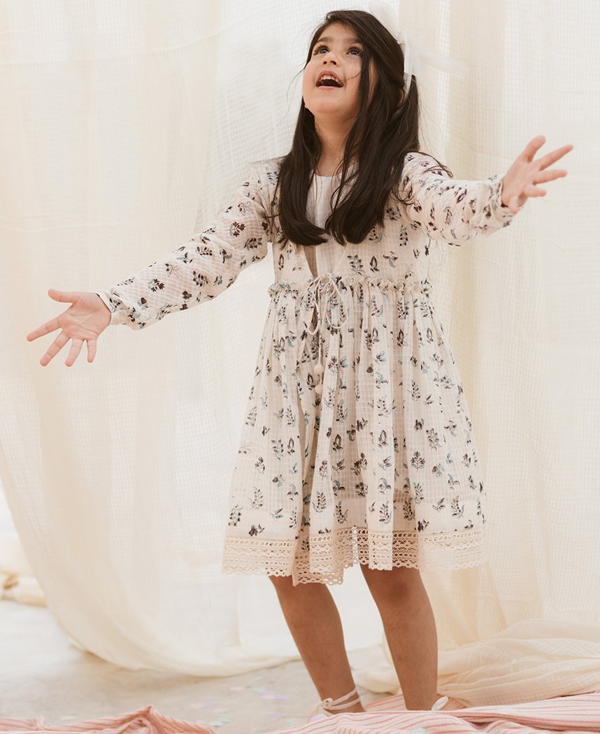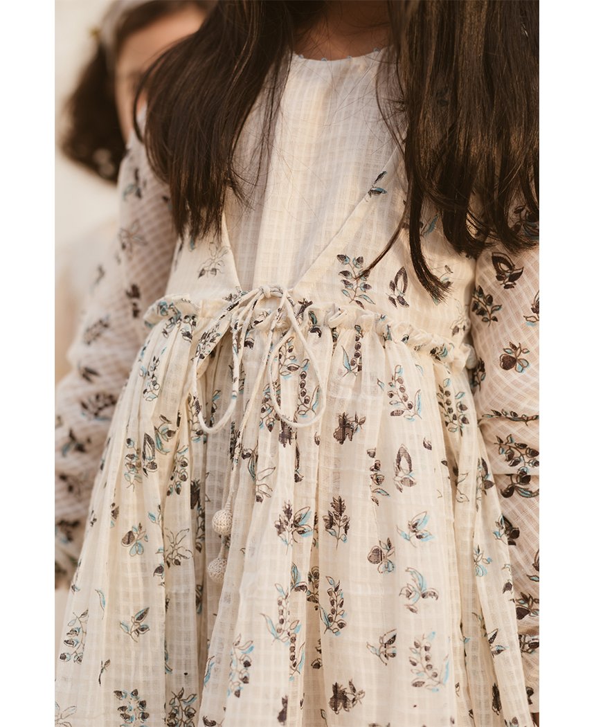A gathered angrakha style dress with hand-block printed flowers and lace detailing at the hem and sleeves. Features tie-up strings at the front with hand-crocheted tassels.