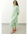 A tunic shirt with embroidery details featuring a front button placket, gathered sleeves and inseam pockets. Length 46". The model is 5'7" and is wearing size M.