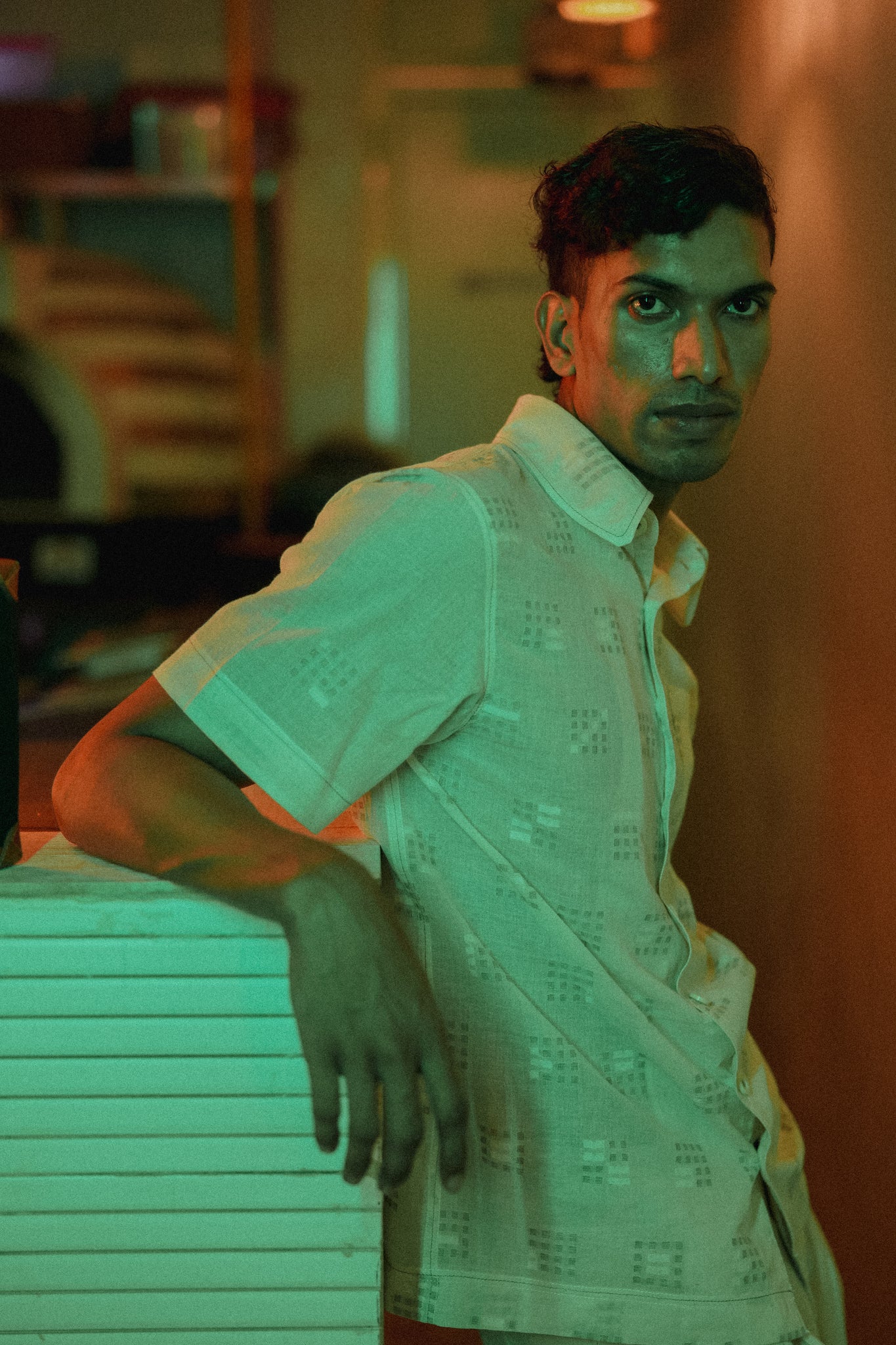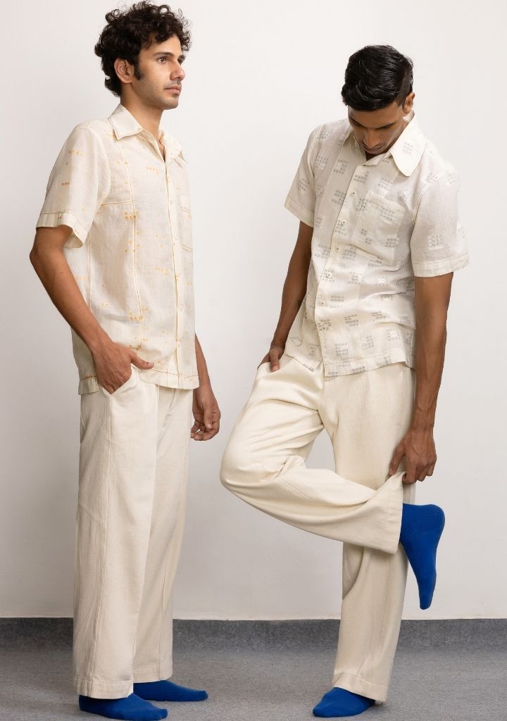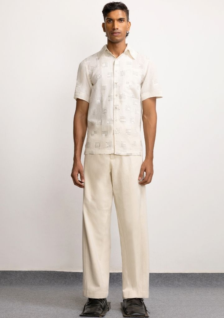 A handwoven Jamdani shirt with an engineered 'missing block' effect, an inverted box pleat at the centre back and a patch pocket. Features a shirt collar and short sleeves. Length 27". The model is 5'10" and is wearing size M.
