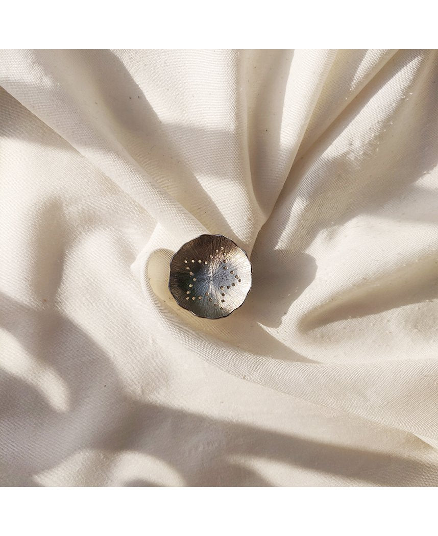 An eccentric adjustable piece, moulded in 3 dimension, with the silhouette of a mogra. Made in brass.