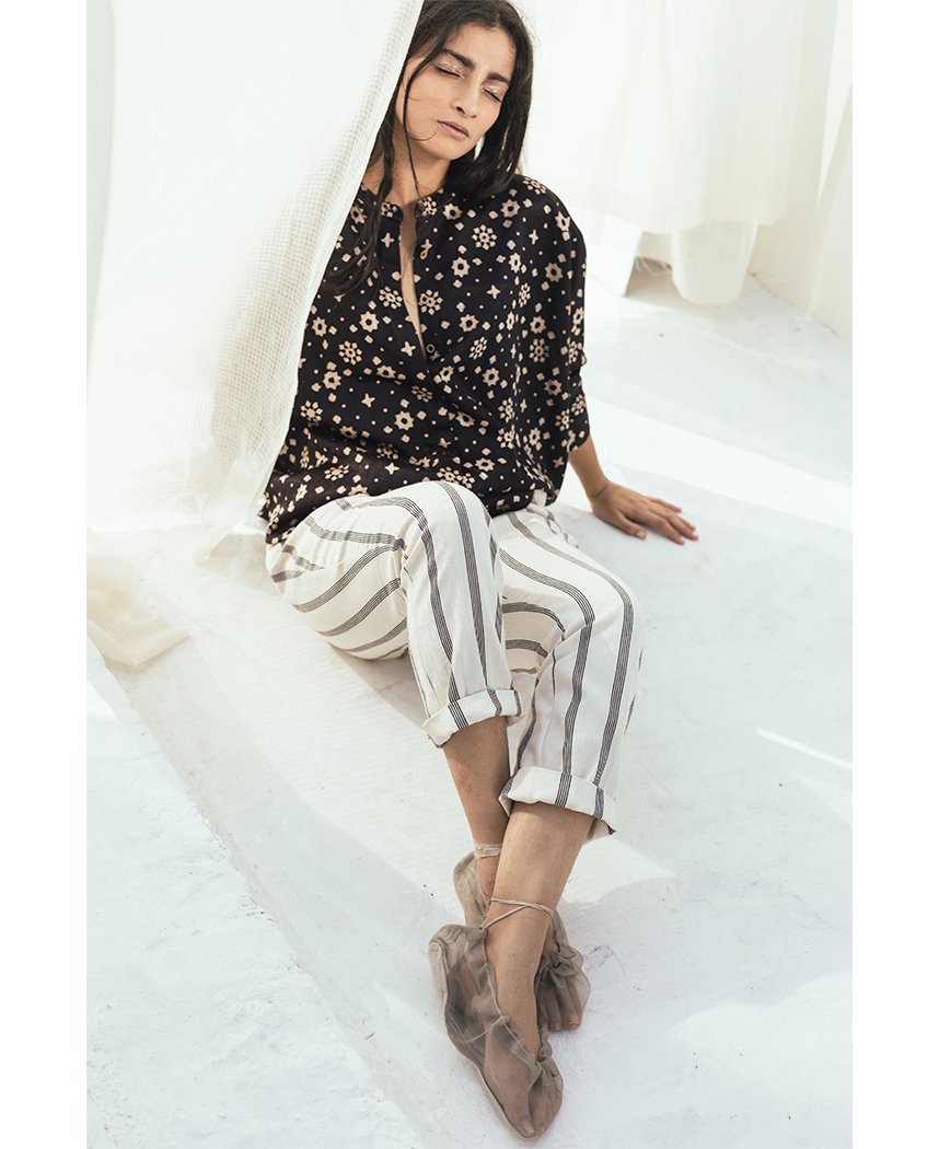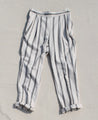 Tapered pleated pants made in striped handwoven cotton. Has side pockets, a concealed side zipper and back elastic waistband. Length 37".