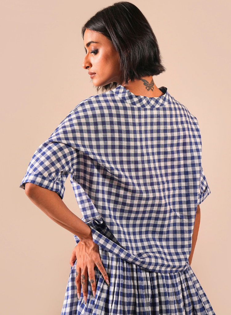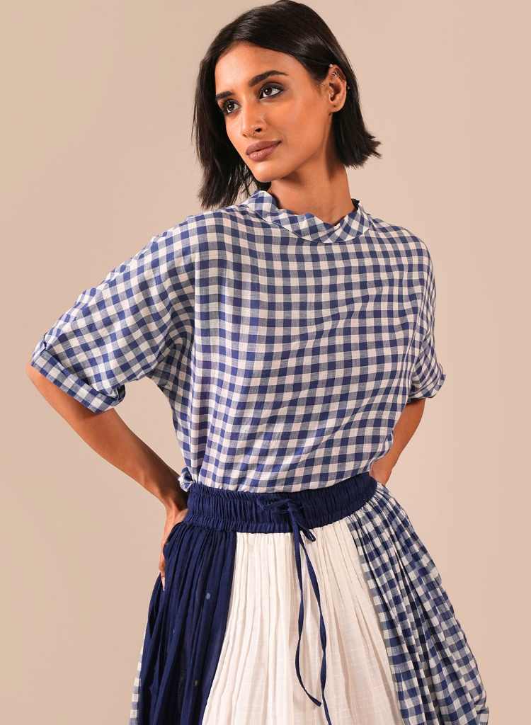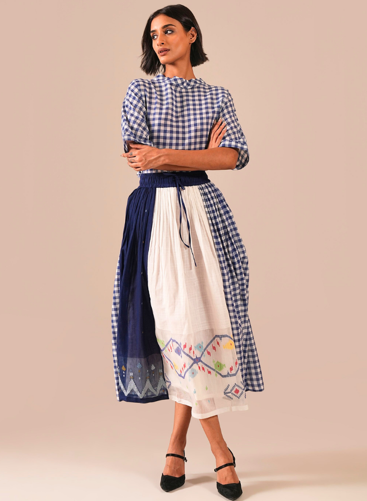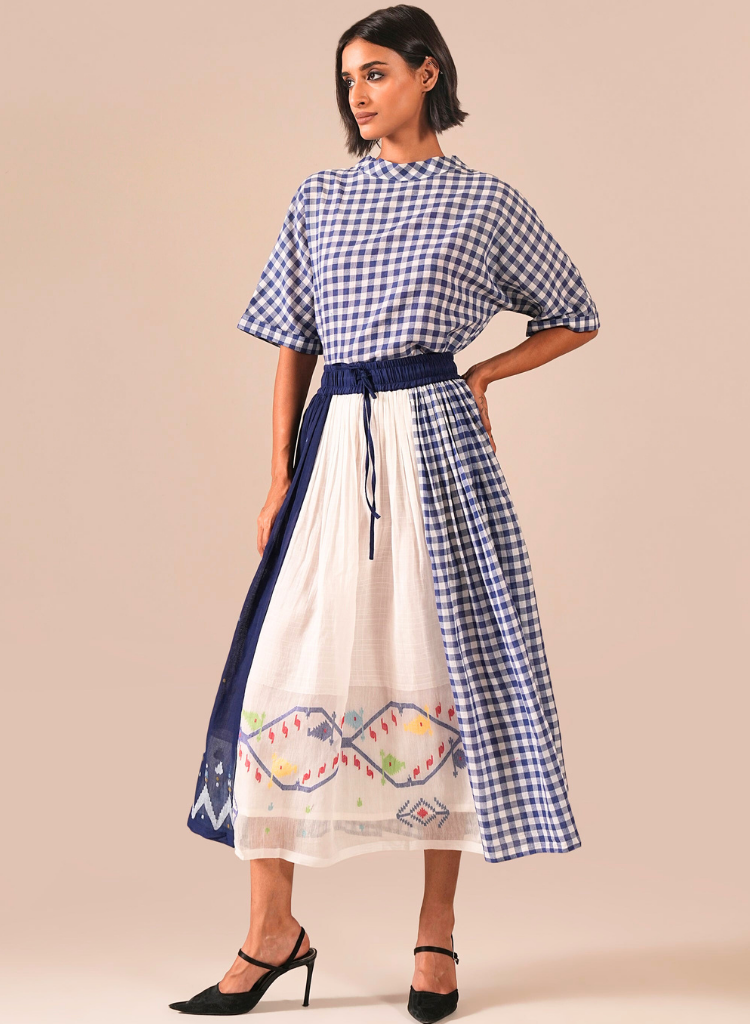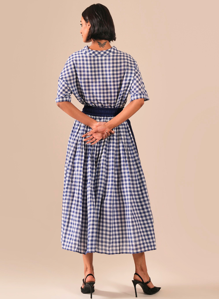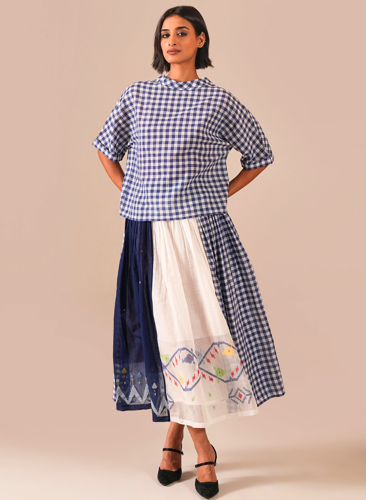 A two-piece set pairing a boxy top and a gathered skirt. The boxy top features short sleeves and contrast panel detailing. Length 22". The gathered skirt features an elasticated waist and side pockets. Length 35". Fully lined. The model is 5'8" and is wearing size S.