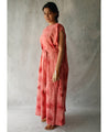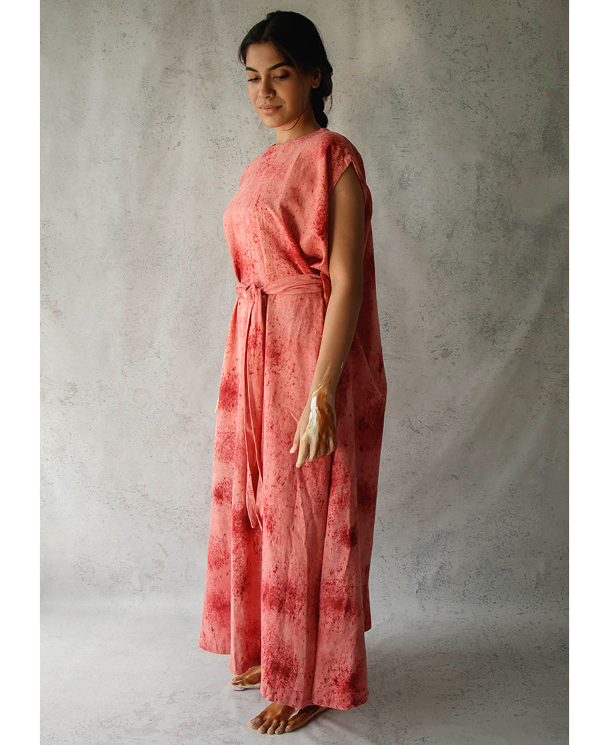 A relaxed textured cowl dress with a tie-up belt that can be tied in multiple ways. Features a closed round neck and a keyhole button back. Length 51". The model is 5'5" and is wearing size M.