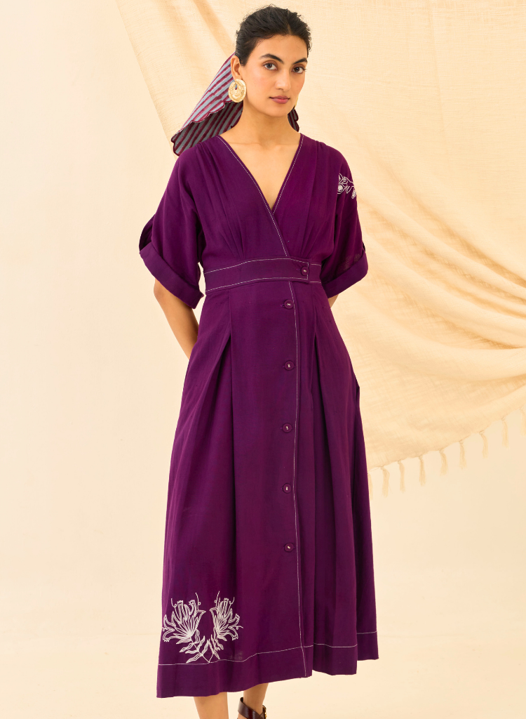 A midi dress featuring a flattering wrap V-neckline and elegant puff sleeves. Length 48". The model is 5'7" and is wearing a size XS.