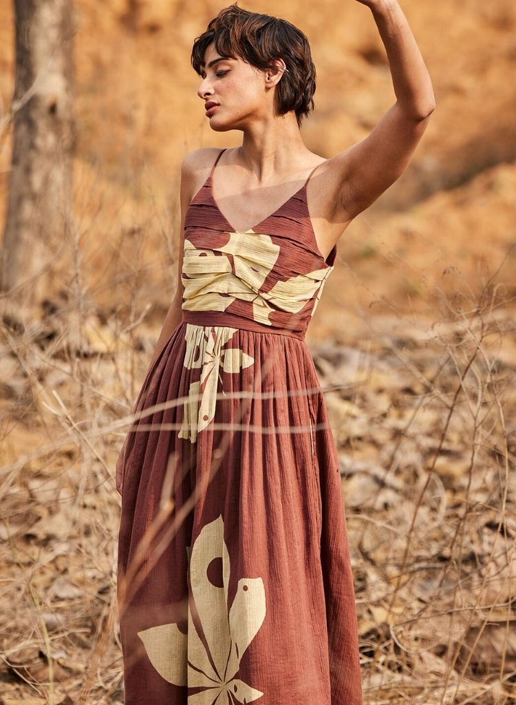 A midi dress with crinckled fabric, statement print. gathered waist and shoulder straps featuring a deep neckline, centre back concealed zipper closure and side seam pockets. Length 49". The model is 5'6" and is wearing size S.