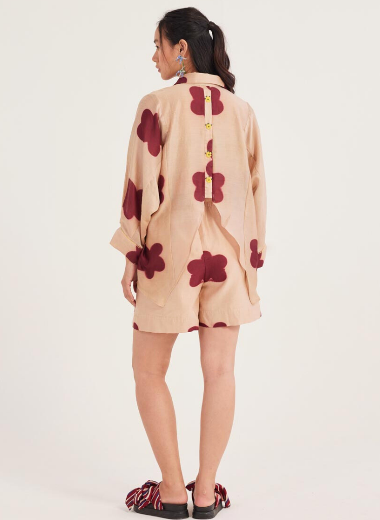 A two-piece set pairing the Nama Shirt and the Nama Shorts. Length 29". A slouchy, slightly oversized fitting clamp dyed shirt featuring an asymmetric hemline and an interesting back detail with a cute hand embroidery you can’t miss. The shorts feature a cozy, elasticated waistline with ties. The model is 5'6" and is wearing a size S.