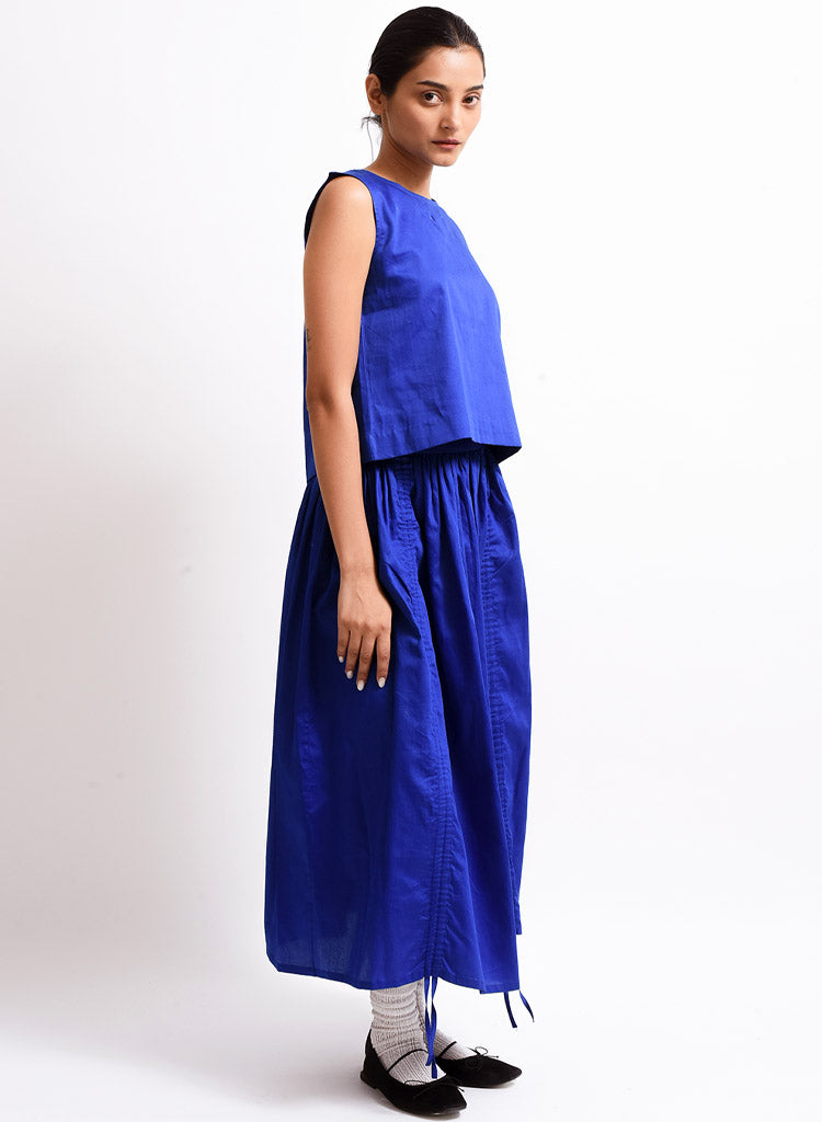 A two-piece set pairing the Nancy Top and the Nancy Skirt. The solid top with a pleat at the back features a round neck and a loop button at the back. Length 17". The A-line midi skirt with two drawstrings to gather and ruche at the front upper thighs features a wide flattering waistband and invisble side zip opening. Length 32". The model is 5’4 and is wearing a size XS.