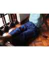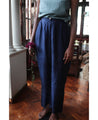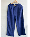 A pair of straight-fit pants with front pleats featuring a fitted waist. Length 40". The pants are slightly translucent and not lined. The model is 5'8" and is wearing a size M.