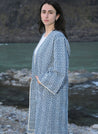 A long jacket with Kantha block print and side pockets featuring long, relaxed-fitting sleeves. Length 41". The model is 5'9" and is wearing a size M.