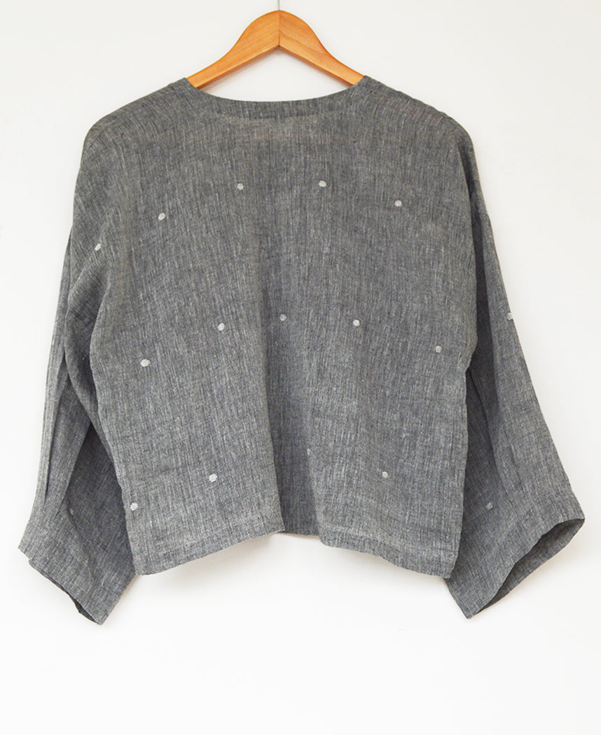 A long sleeve shirt with polka dots featuring a round neck and a concealed front button placket. Length 22".
