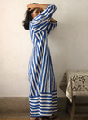 A striped piece that lends itself to all sorts of occasions. Features block printed stripes, gathered sleeves and a hemline perfectly compliment the neck line. Length 52". The model is 5'7" and is wearing a size M.