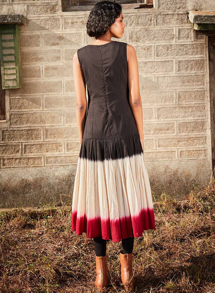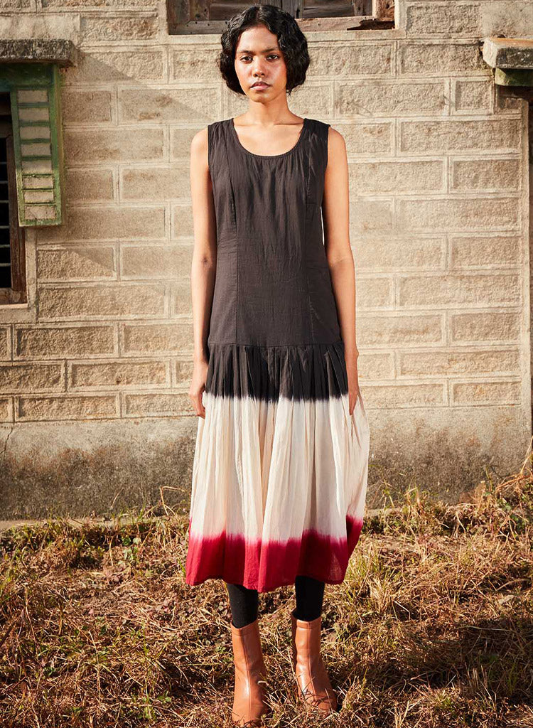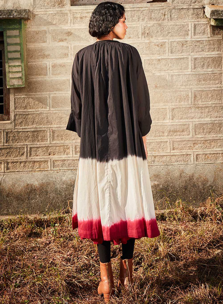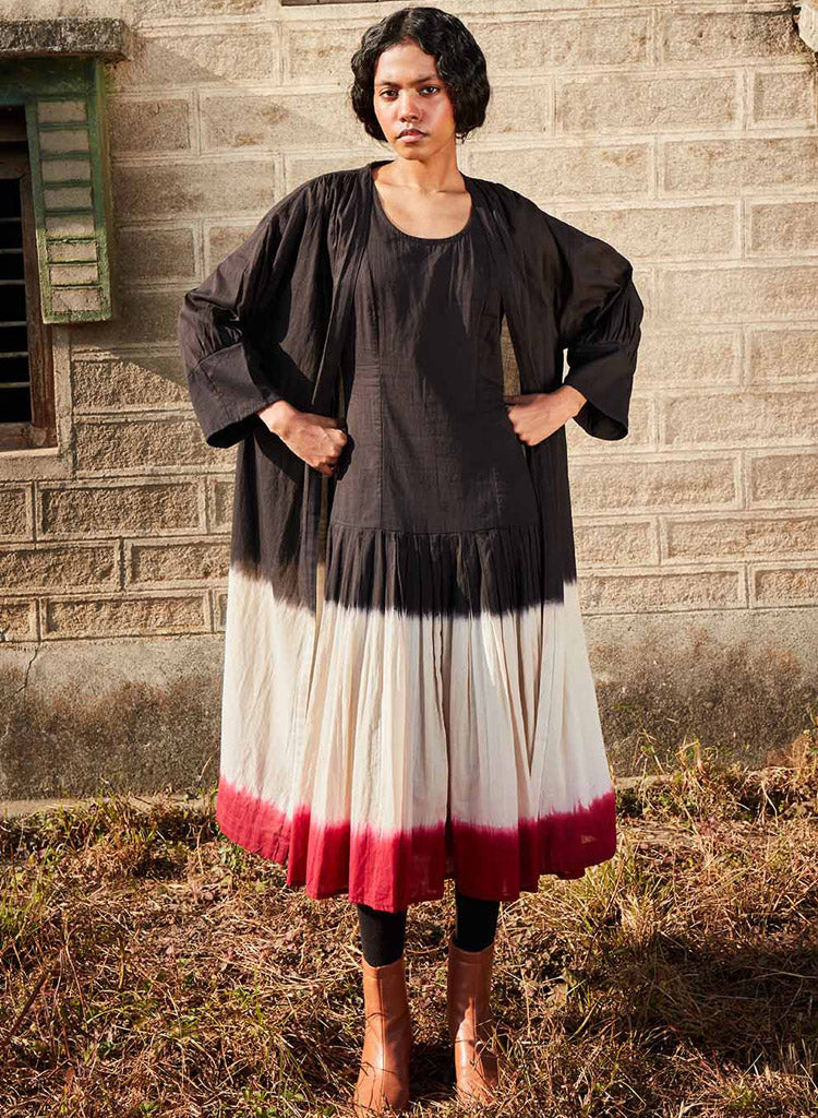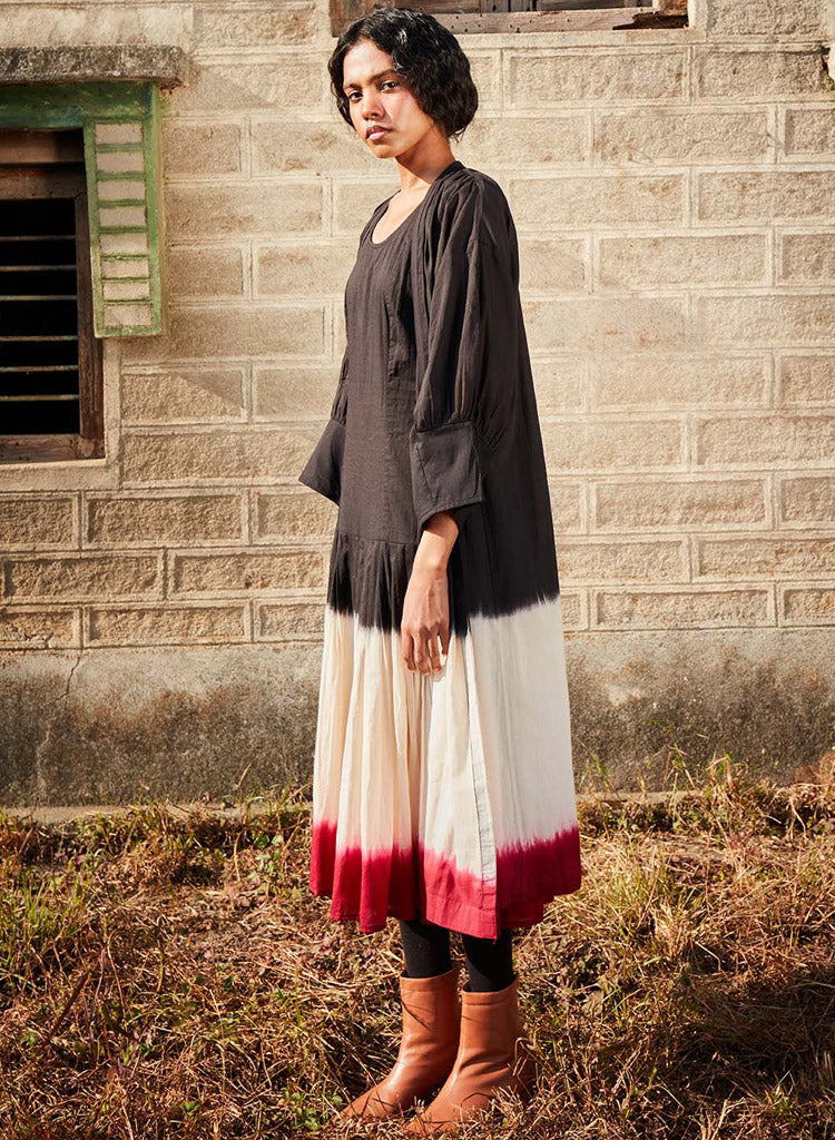 A two piece set pairing a dip dyed dress and matching overlay. The charming dip-dyed dress with Shibori detailing at the hem features a round neck and a back zipper. Length 46". The matching overlay features a lapel collar and loose sleeves. Length 46". The model is 5'8" and is wearing a size S.