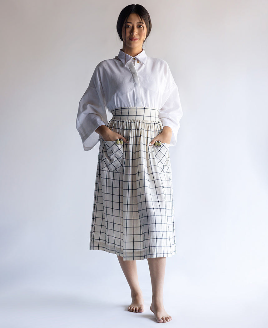 A three-piece set pairing the Nikko Top and Drindl Skirt with the Sheer Collar. The easy-cropped top features kimono sleeves, a round neck, and a concealed front placket. Length 21.5". The gathered checkered skirt features patch pockets, handmade Manipuri dolls, and an elasticated back. Length 33". The sheer detachable bib collar features traditional Wangkhei Phee Jamdani motifs, side ties, and front buttons. The model is 5'8".