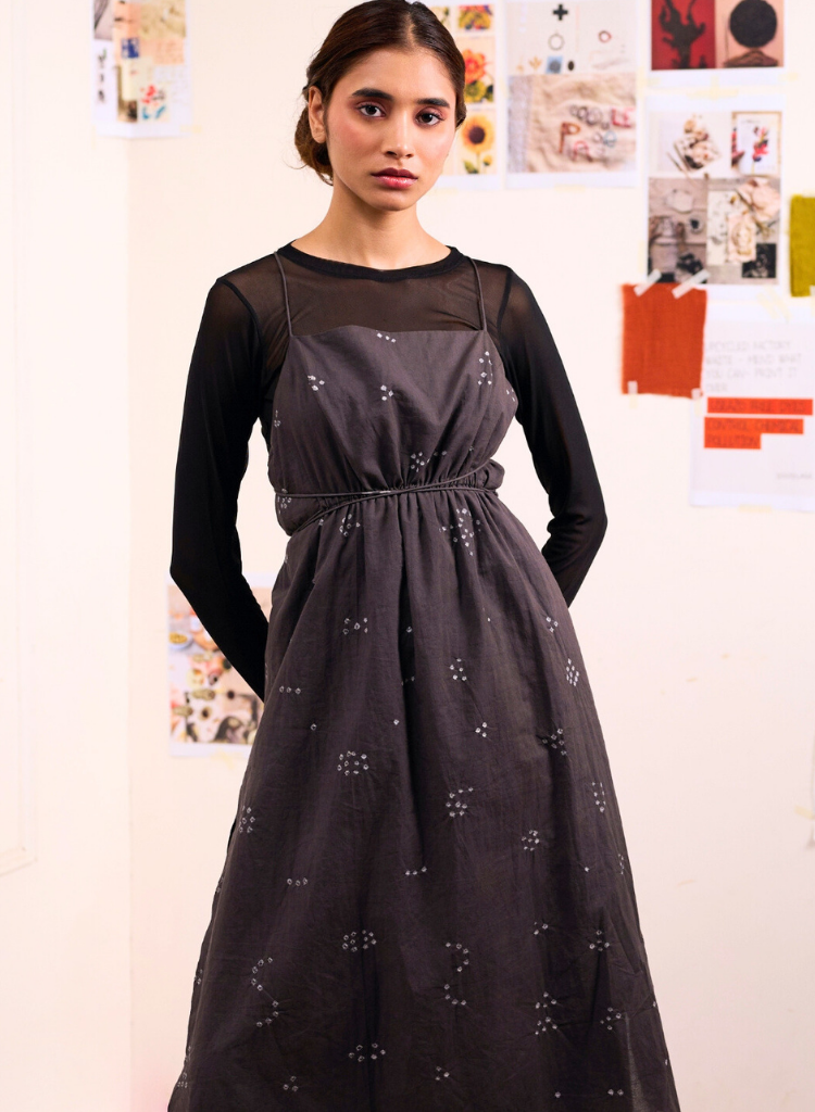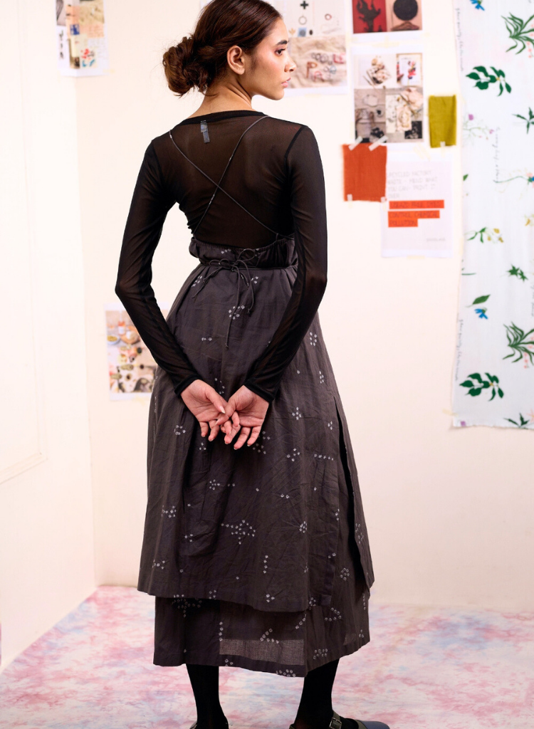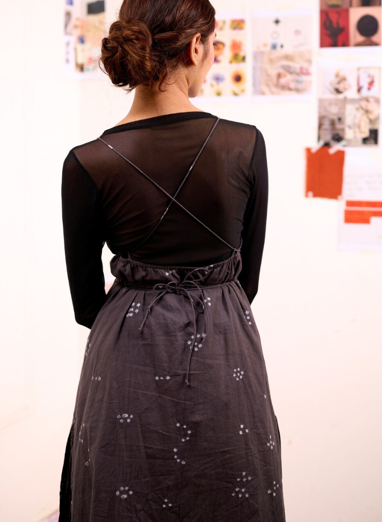 A tunic featuring delicate shoulder straps, a deep back with cross-string detailing, and an adjustable drawstring waist . The model is 5'7" and is wearing size S. Made in organic cotton. Each piece is handcrafted using industrial waste and recycled fabrics, and covered in small irregular embroideries, making it as unique as your personal style.