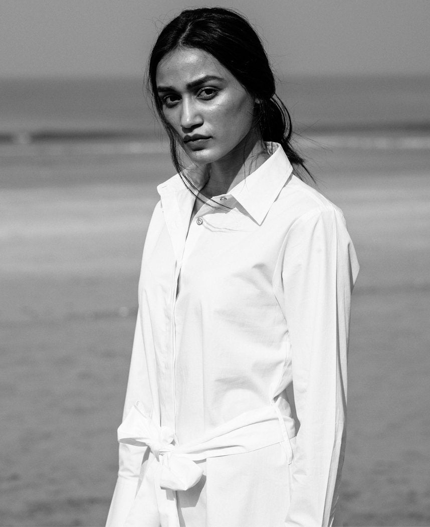 A tie waist shirt dress with wide cuffs and concealed placket. Length 42".