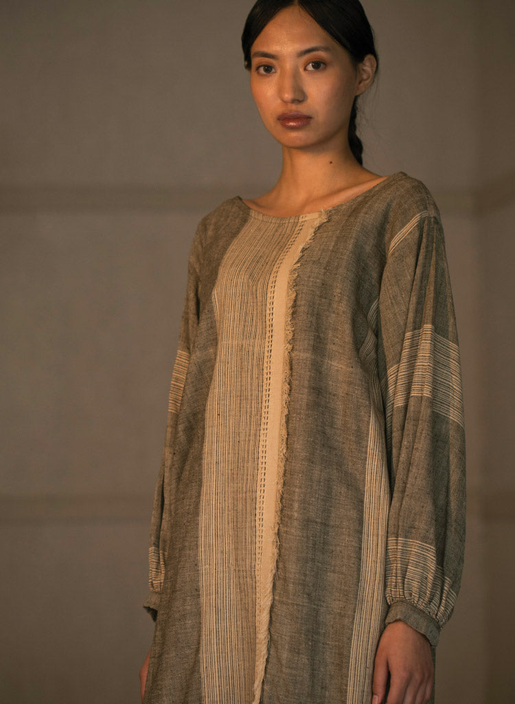 An easy shift dress with bishop sleeves and traditional detailing in the front. Features a boat neck and long cuffed sleeves. The model is 5'6" and is wearing size S.