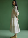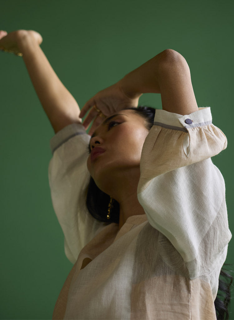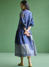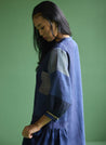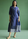A classic mandarin collared patchwork style asymmetric dress combining metallic broad stripe weave. Features 3/4th sleeves and inseam pockets. Length 47.5". The model is 5'8" and is wearing a size S.