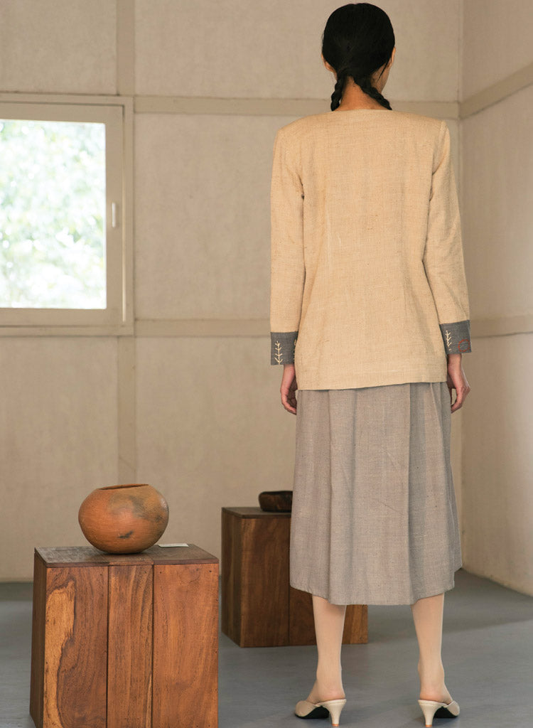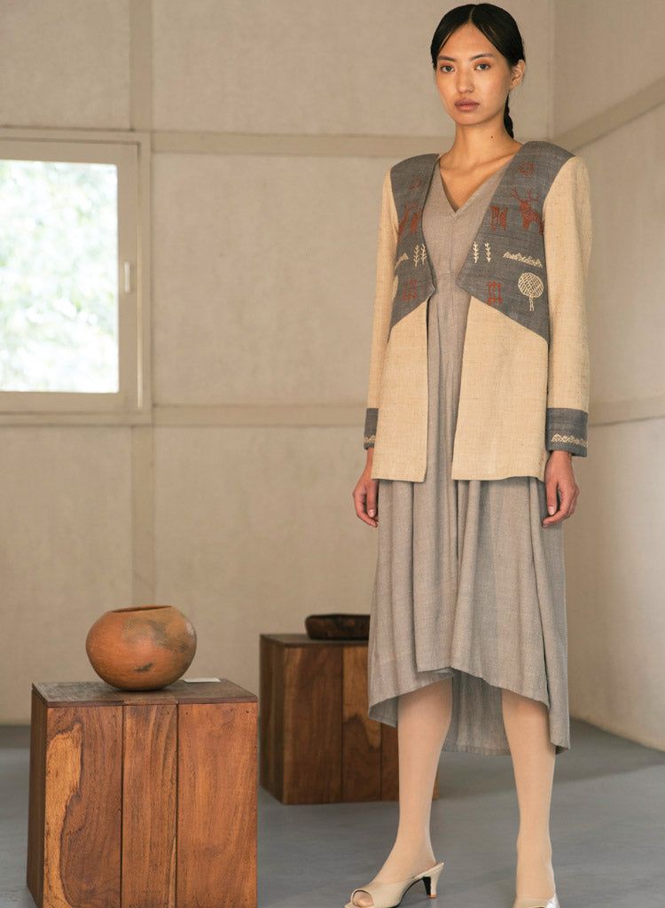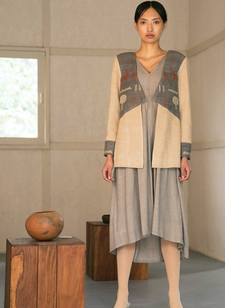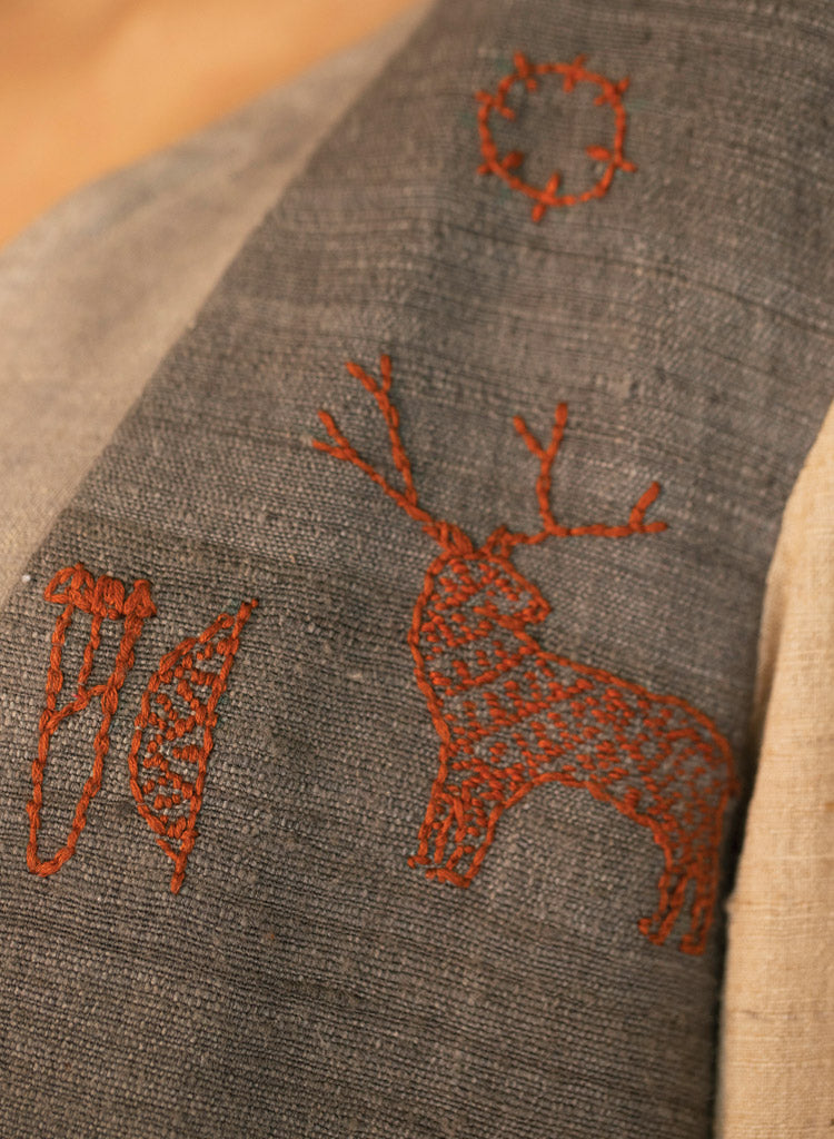 Embellished with ‘khneng’ embroidery, the unique and only known form of embroidery in Meghalaya - oldest and dying art forms practiced by the people of Mustoh village. Inspired by a khasi folktale of ‘U sier lapalang’ the motifs used in this jacket such as a stag, the trees, hills are key elements found in the folktale. The model is 5'6" and is wearing size S.