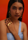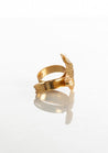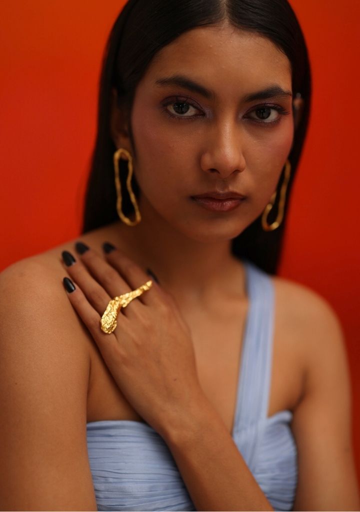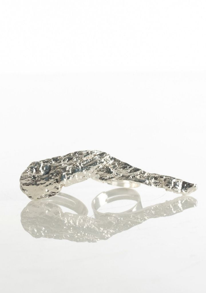 A statement ring featuring a long abstract textured shape with a smooth adjustable band. Dimensions 7cm.