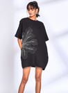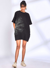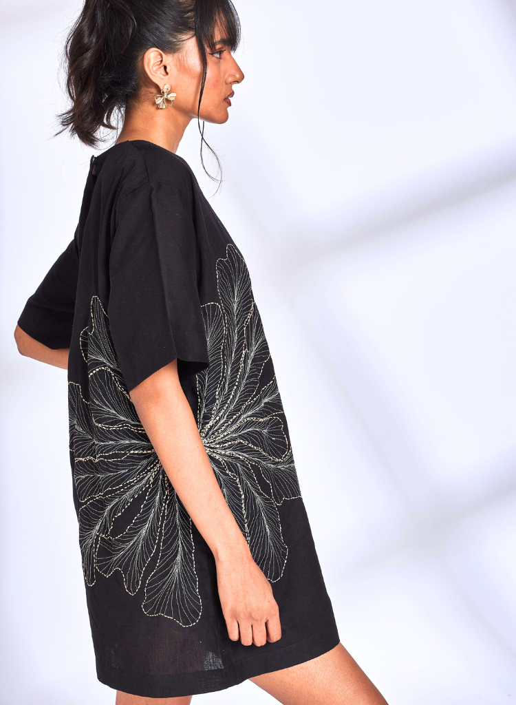 A floral embroidered mini dress featuring a closed round neck and inseam pockets. Length 32". The model is 5'8" and is wearing size S.