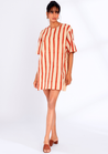 A striped Ajrakh hand-block printed mini dress featuring a closed round neck and inseam pockets. Length 32". The model is 5'8" and is wearing size S.