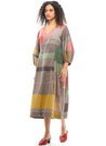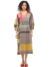 A striped midi dress featuring a V-neck, 3/4th gathered sleeves, and inseam pockets on both sides. Made in 100% cotton. The model is 5'7" and wears a size S. This product is handwoven and handcrafted. Slight differences in the colour, texture and finish are to be cherished, not misunderstood.